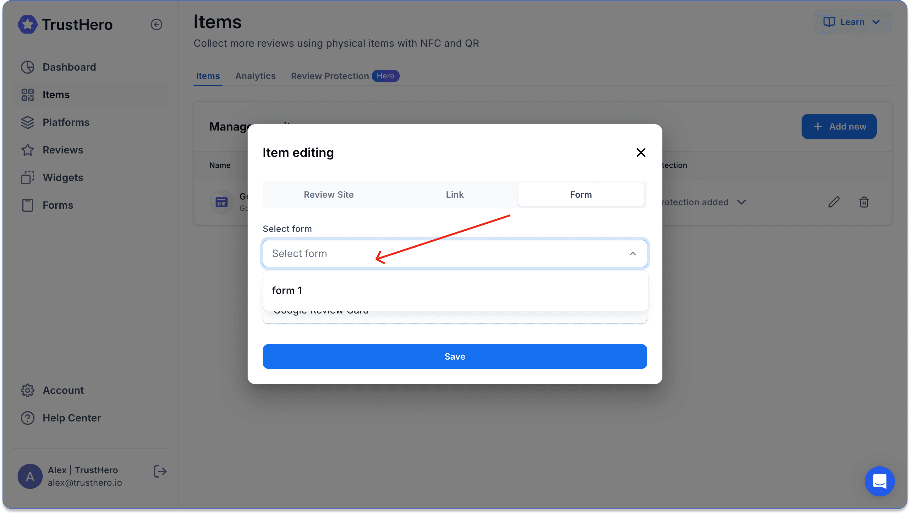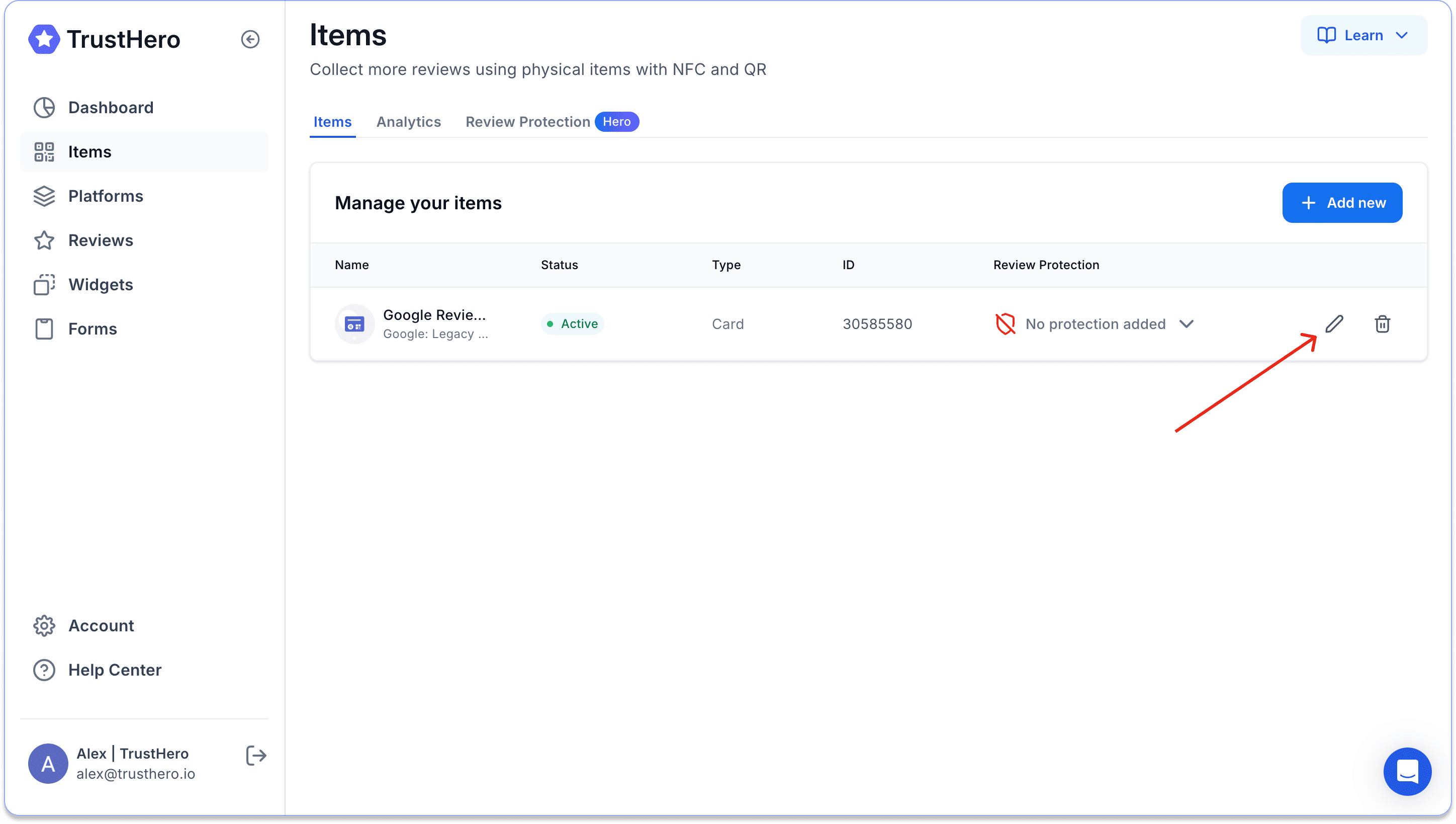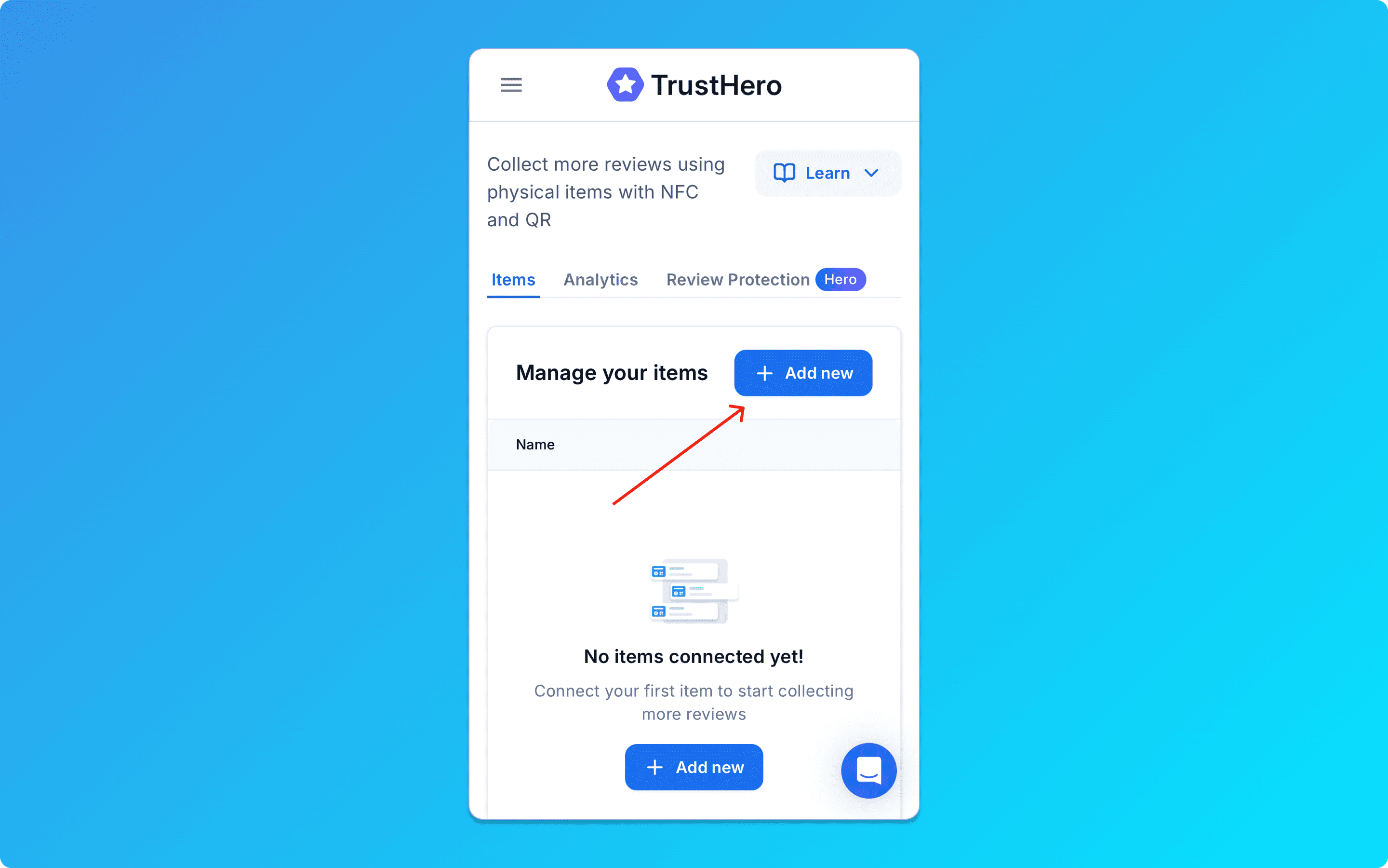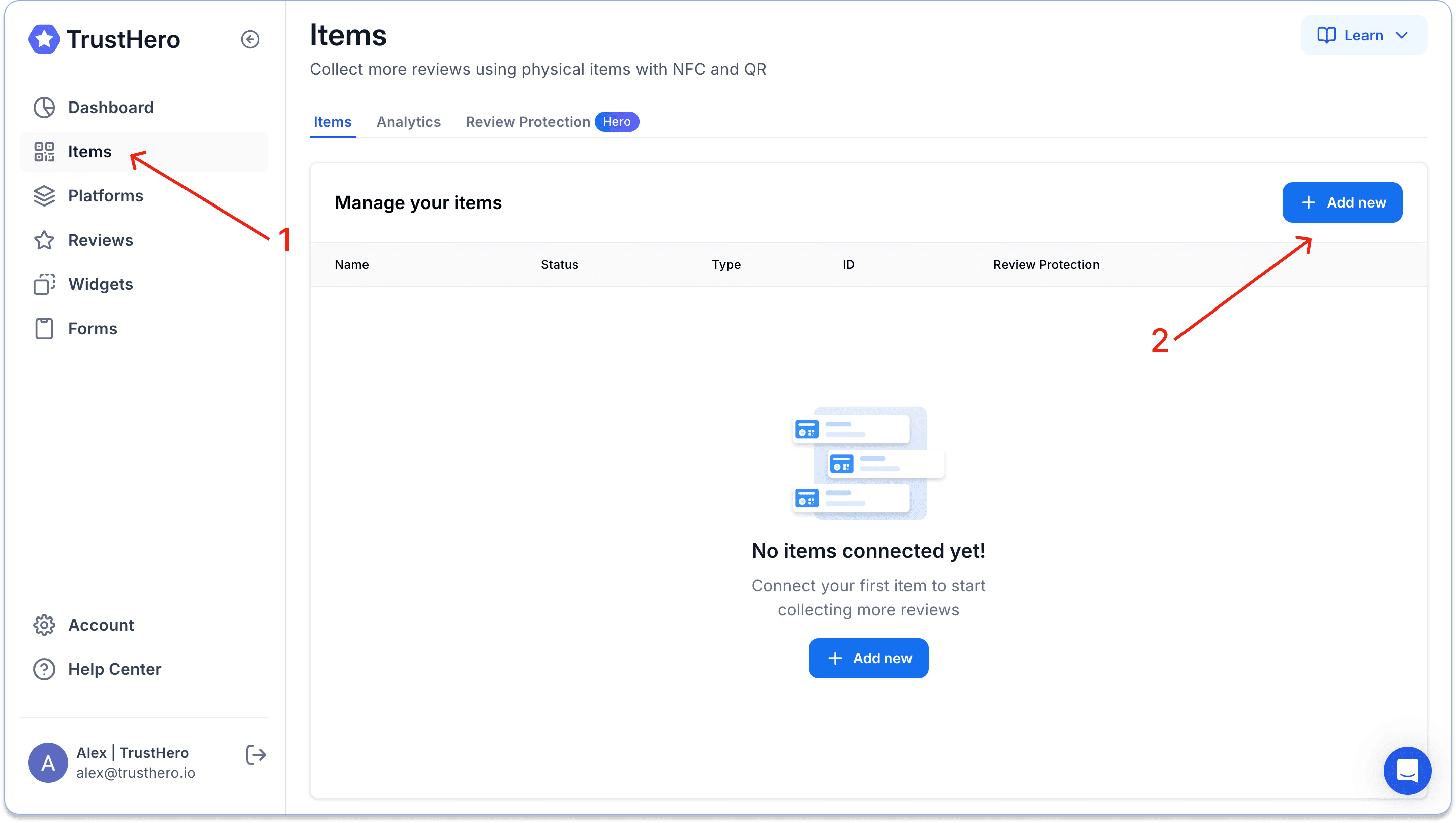 Navigate to the Items tab in the left-side menu and click Add Item.