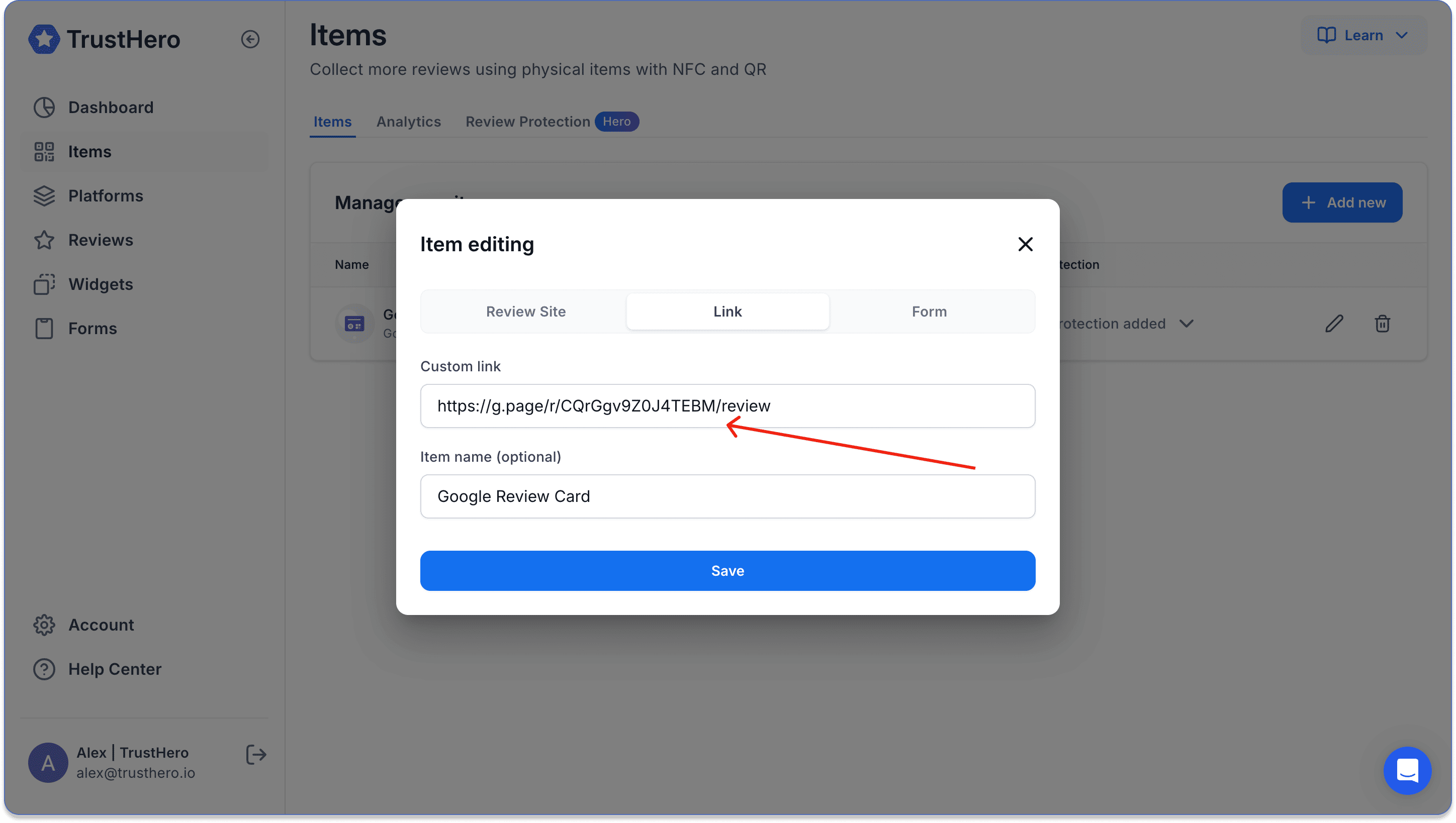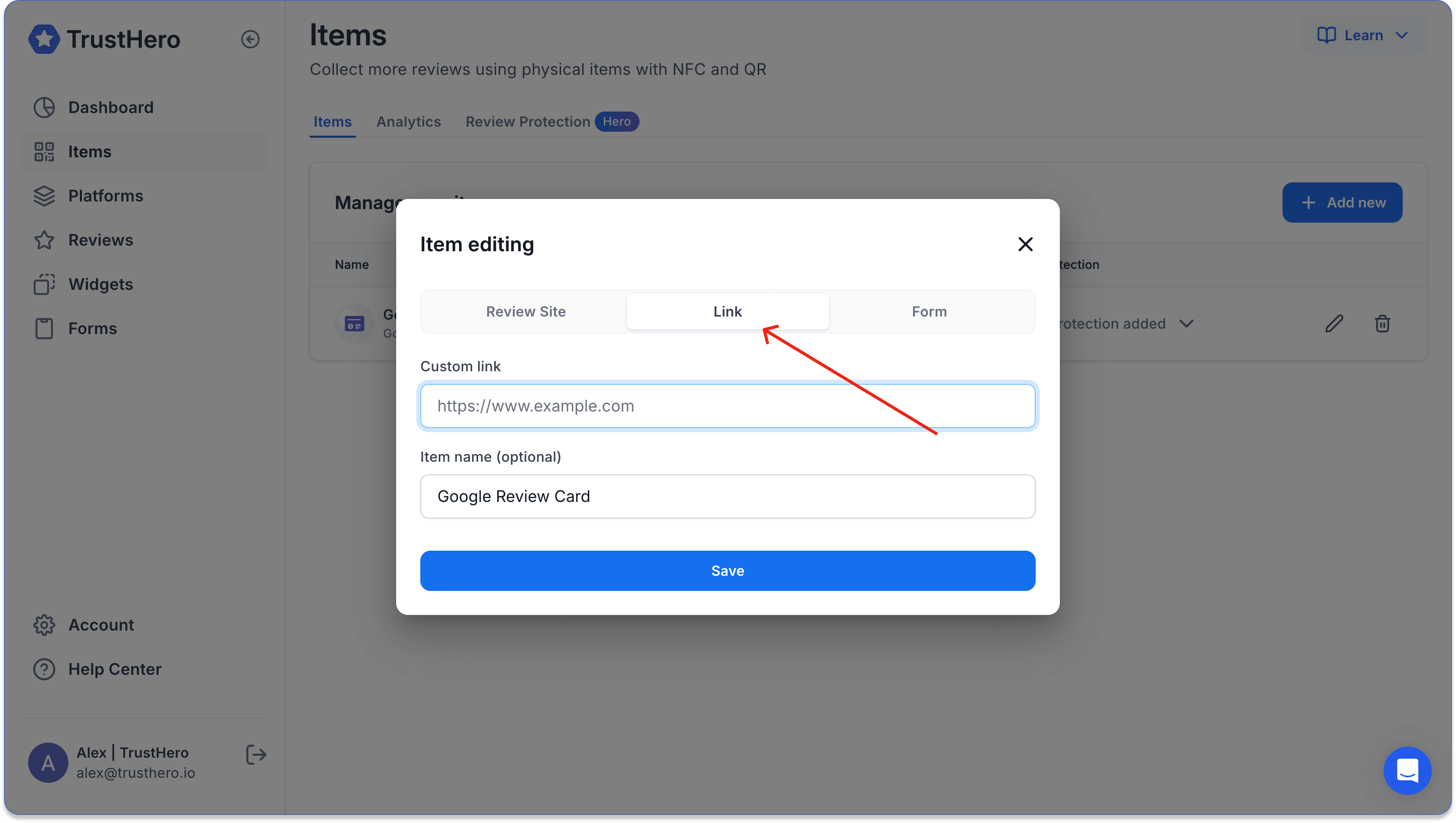 You can configure redirection from your item to any link. To do this, go to the Link tab.
