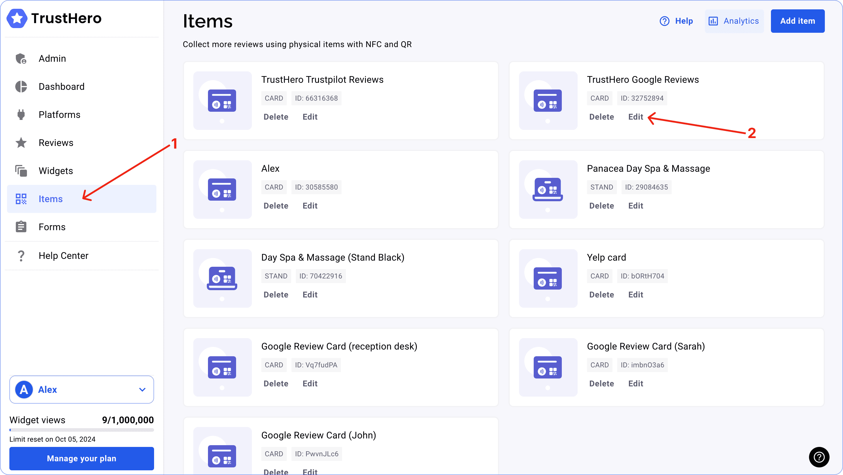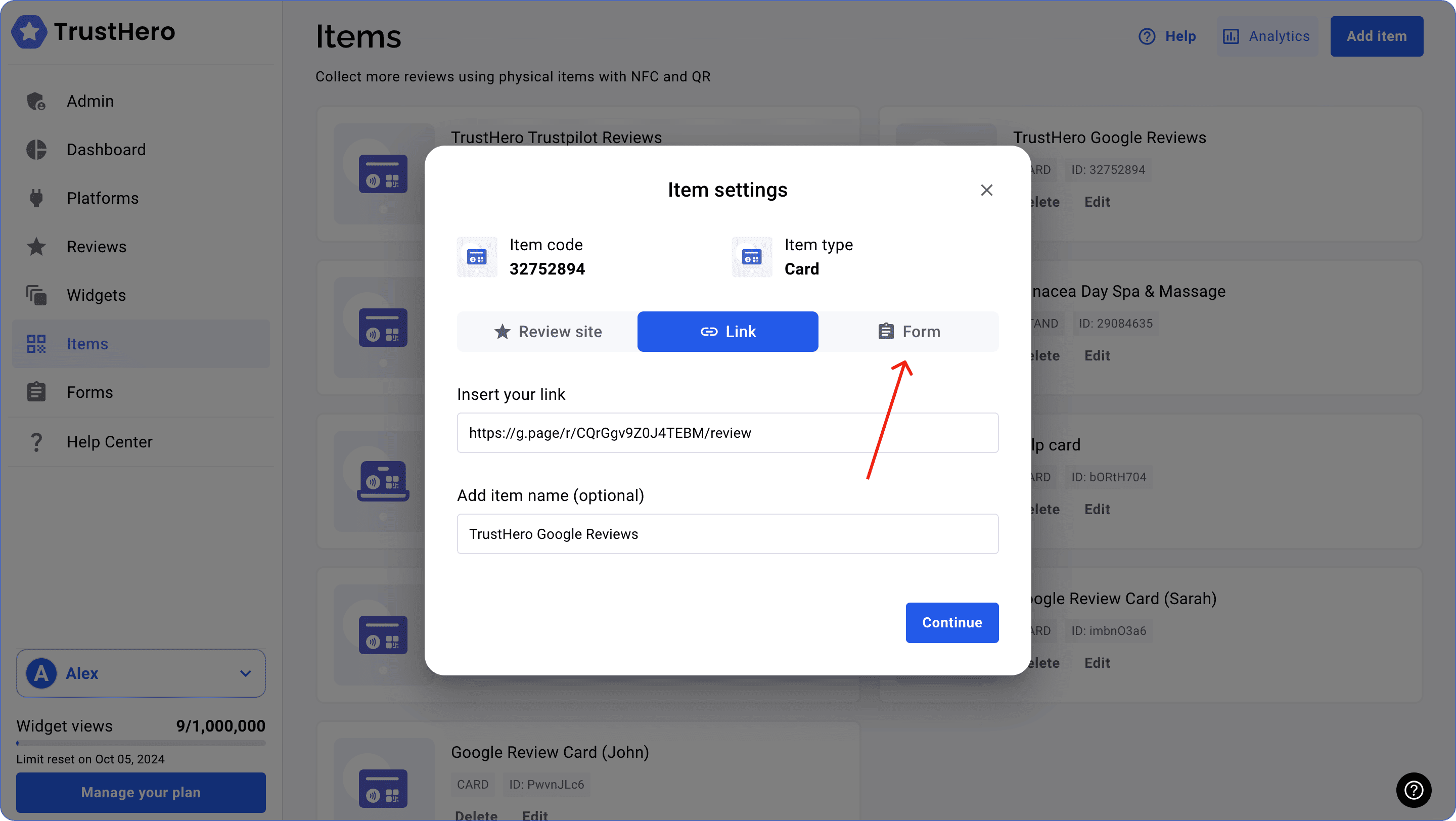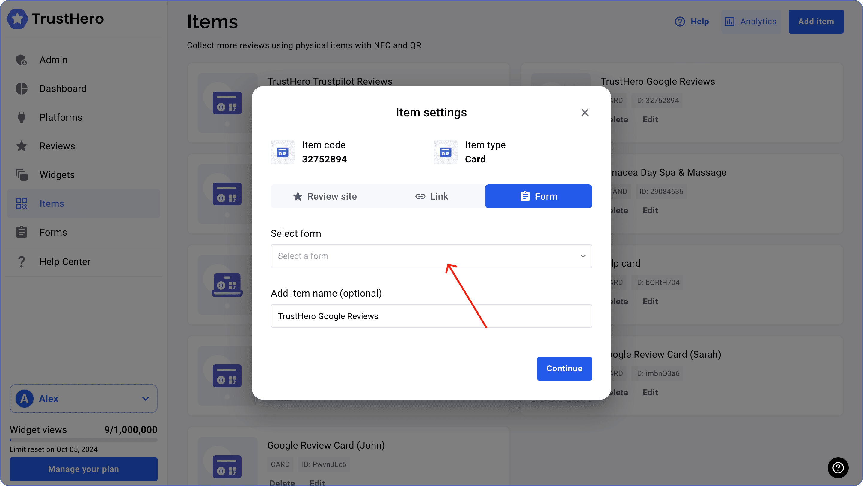 Click the Items tab. Select the item to which you want to connect the form and click Edit.